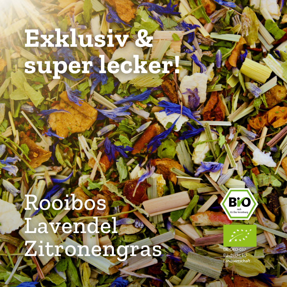 Apfelstücke*, Rooibos*, Melisse, Zitronengras*, Orangenschalen* (9%), Lavendelblüten* (4,5%), Zitronenverbene*, Süßkraut*, Kornblumenblüten*, Baldrian*, Hopfenblüten*